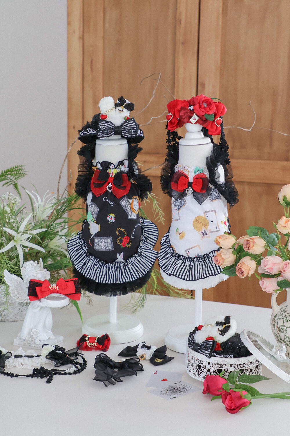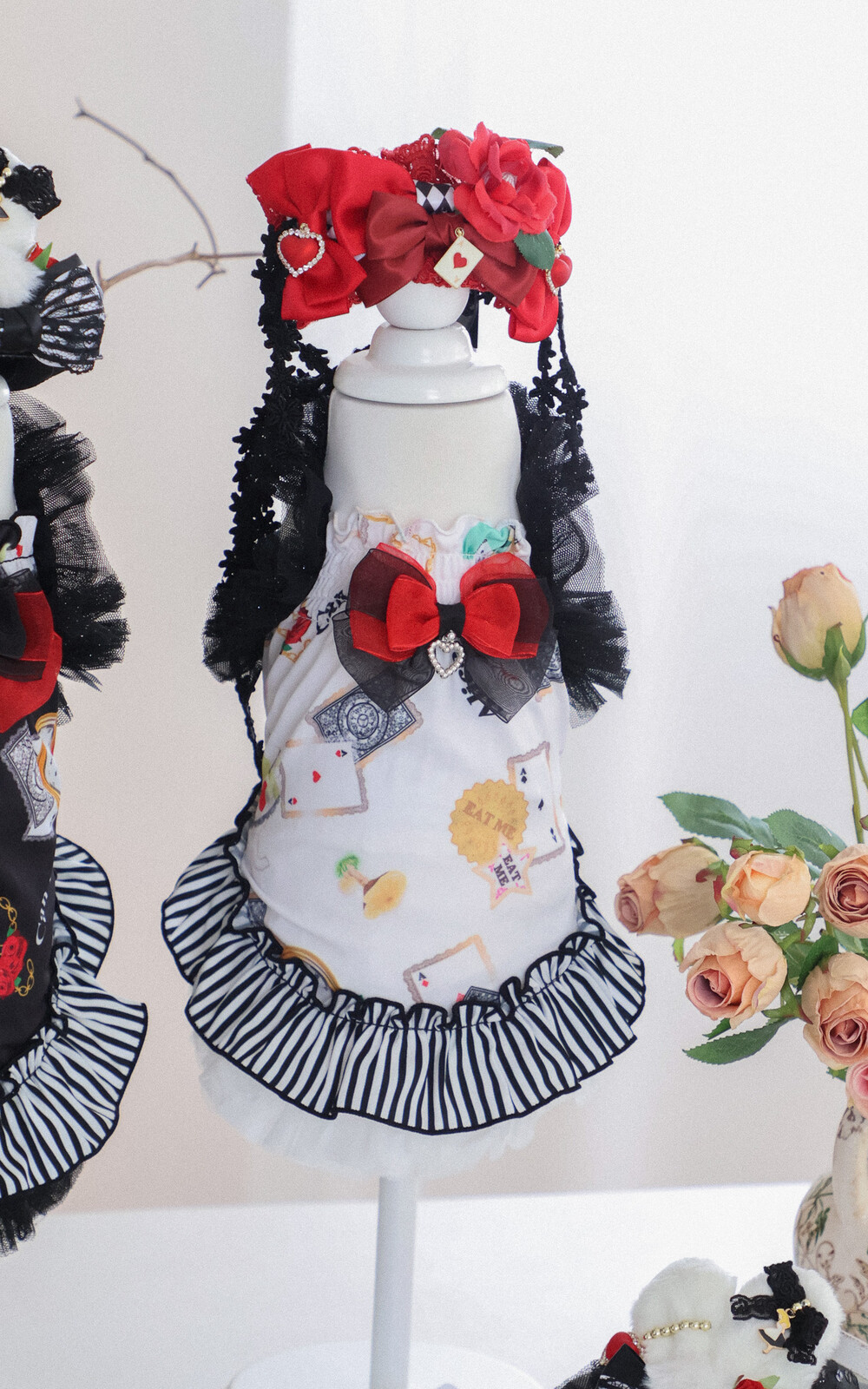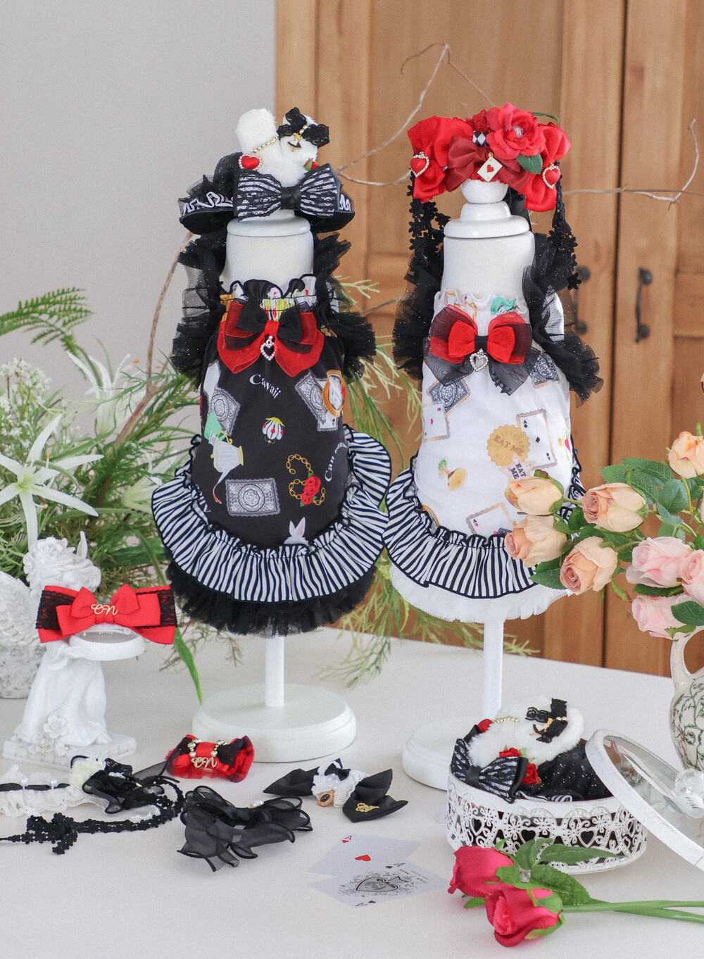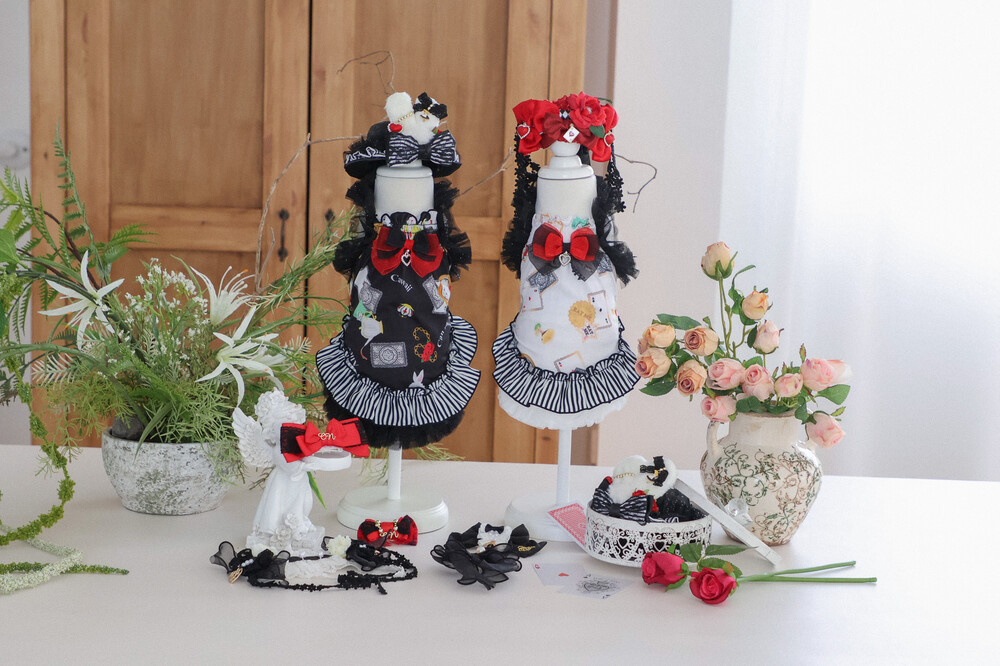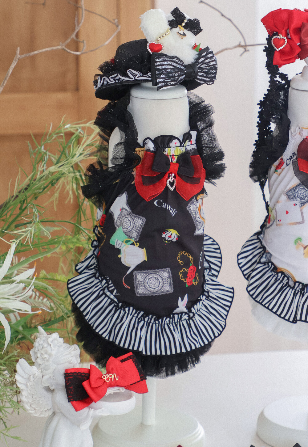 고급스러운 레드 × 블랙 리본과 앨리스 무늬 패턴이