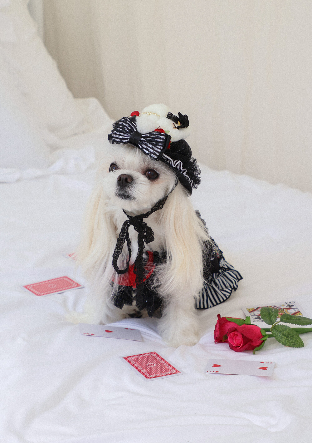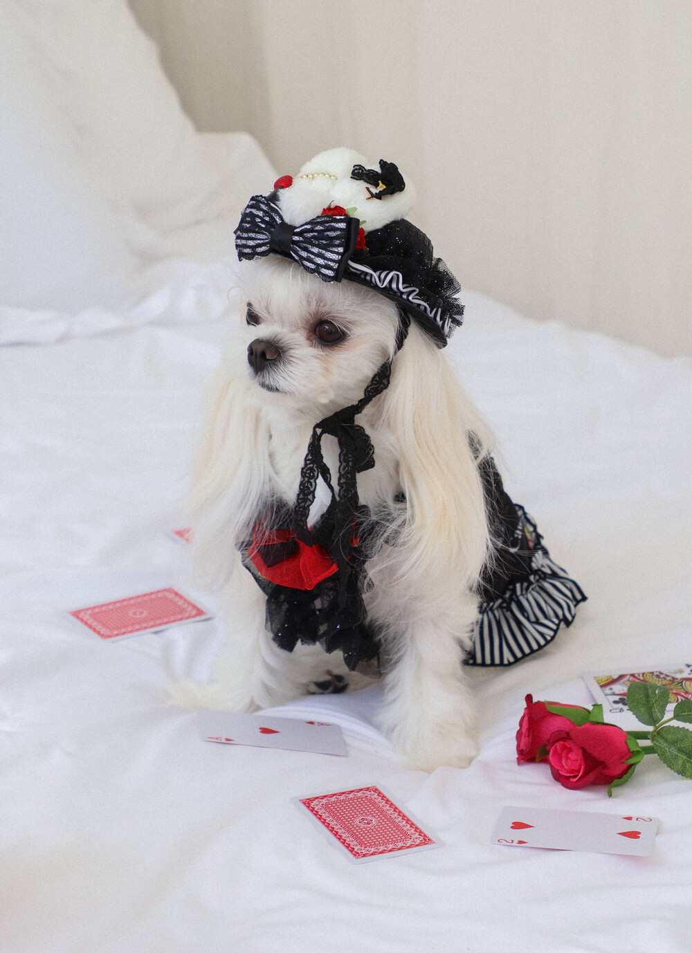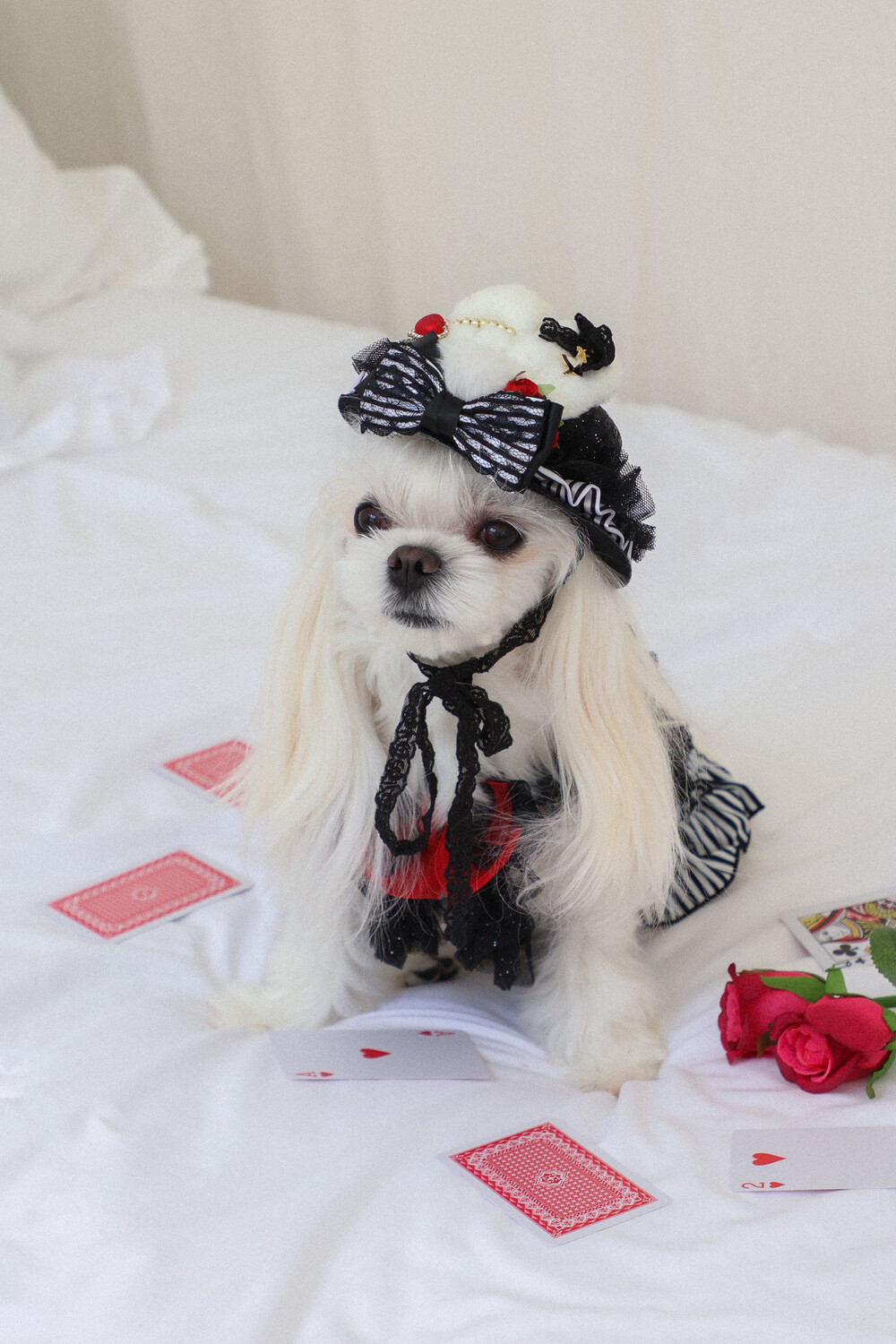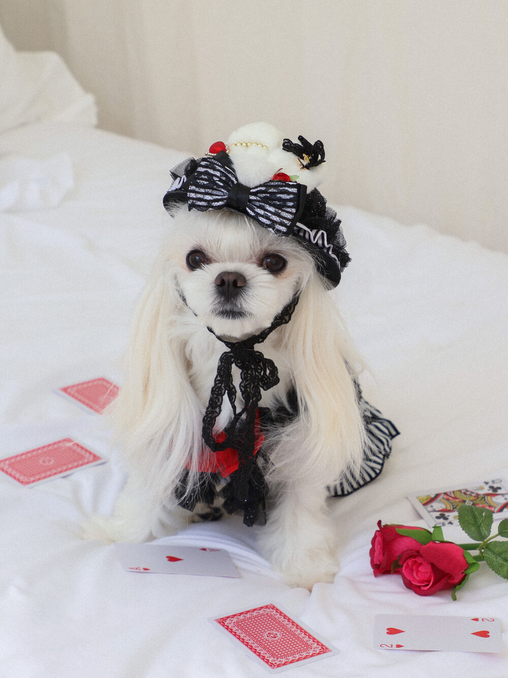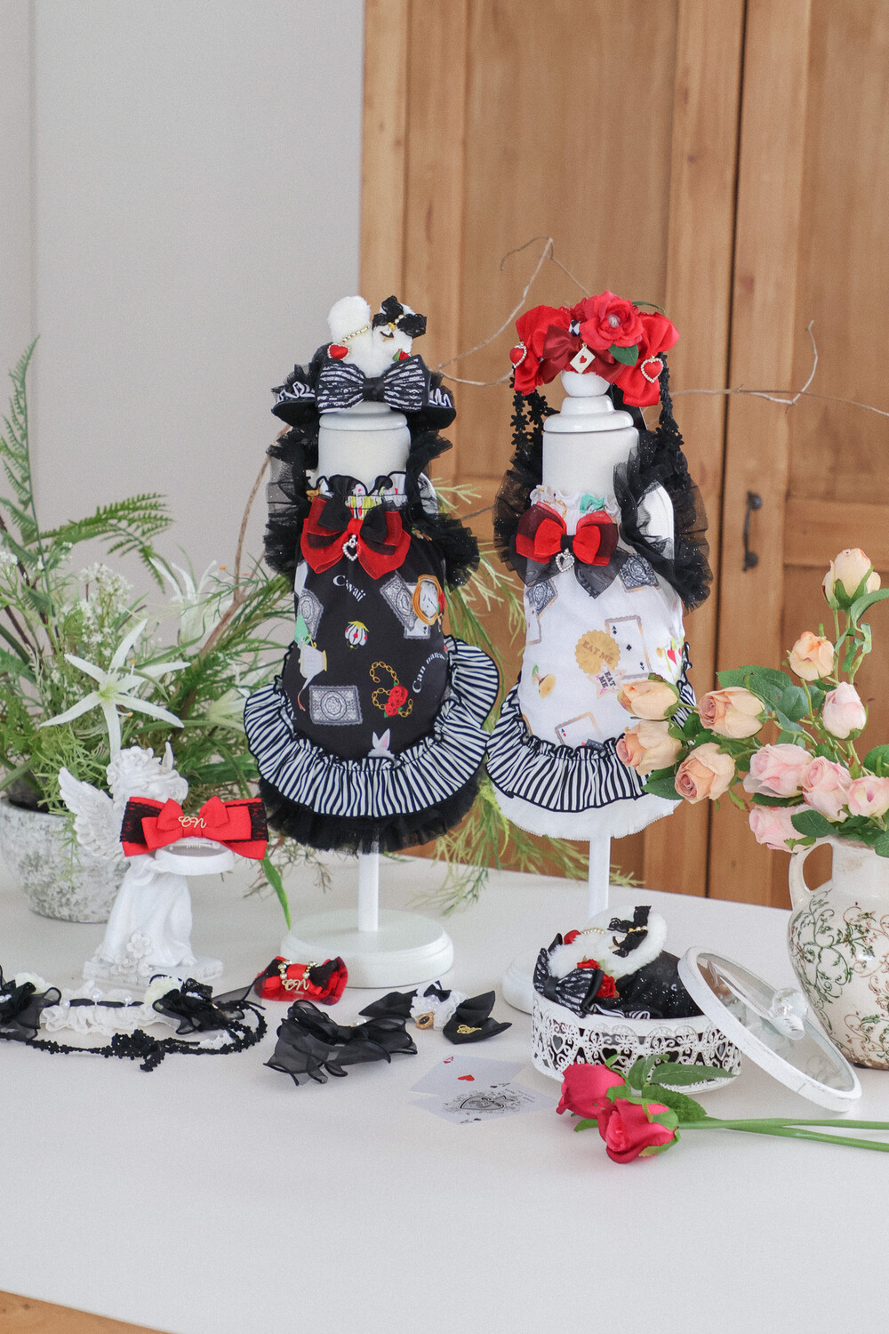 고급스러운 레드 × 블랙 리본과 앨리스 무늬 패턴이