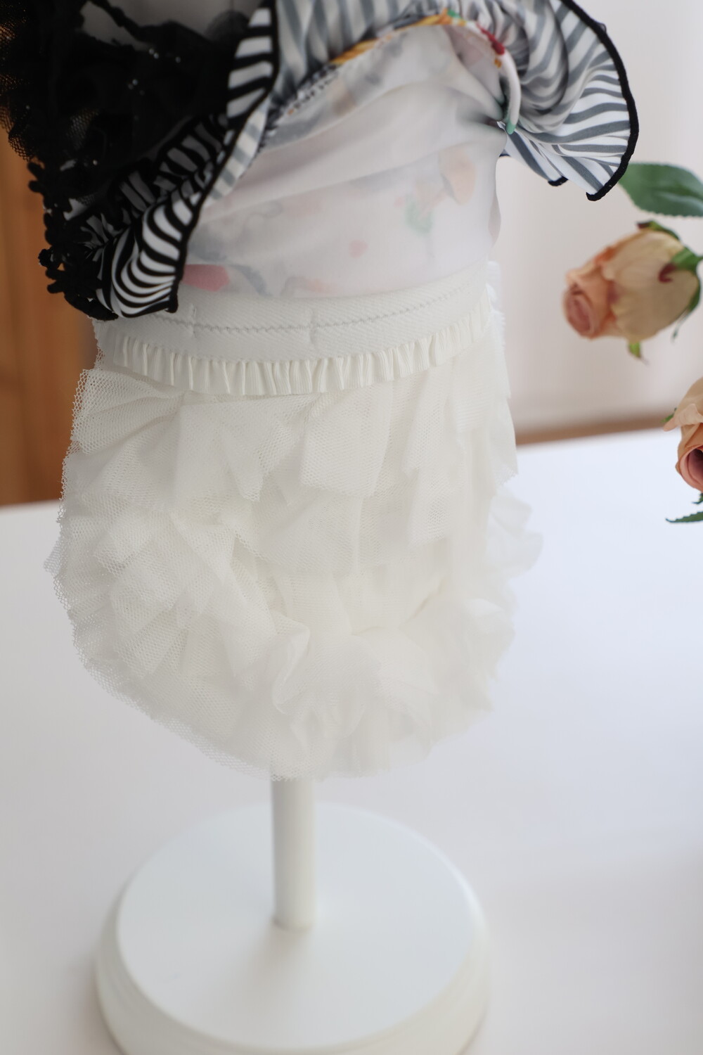 풍성한 스트라이프 프릴과 어깨의 튤 장식이 레이어드되어