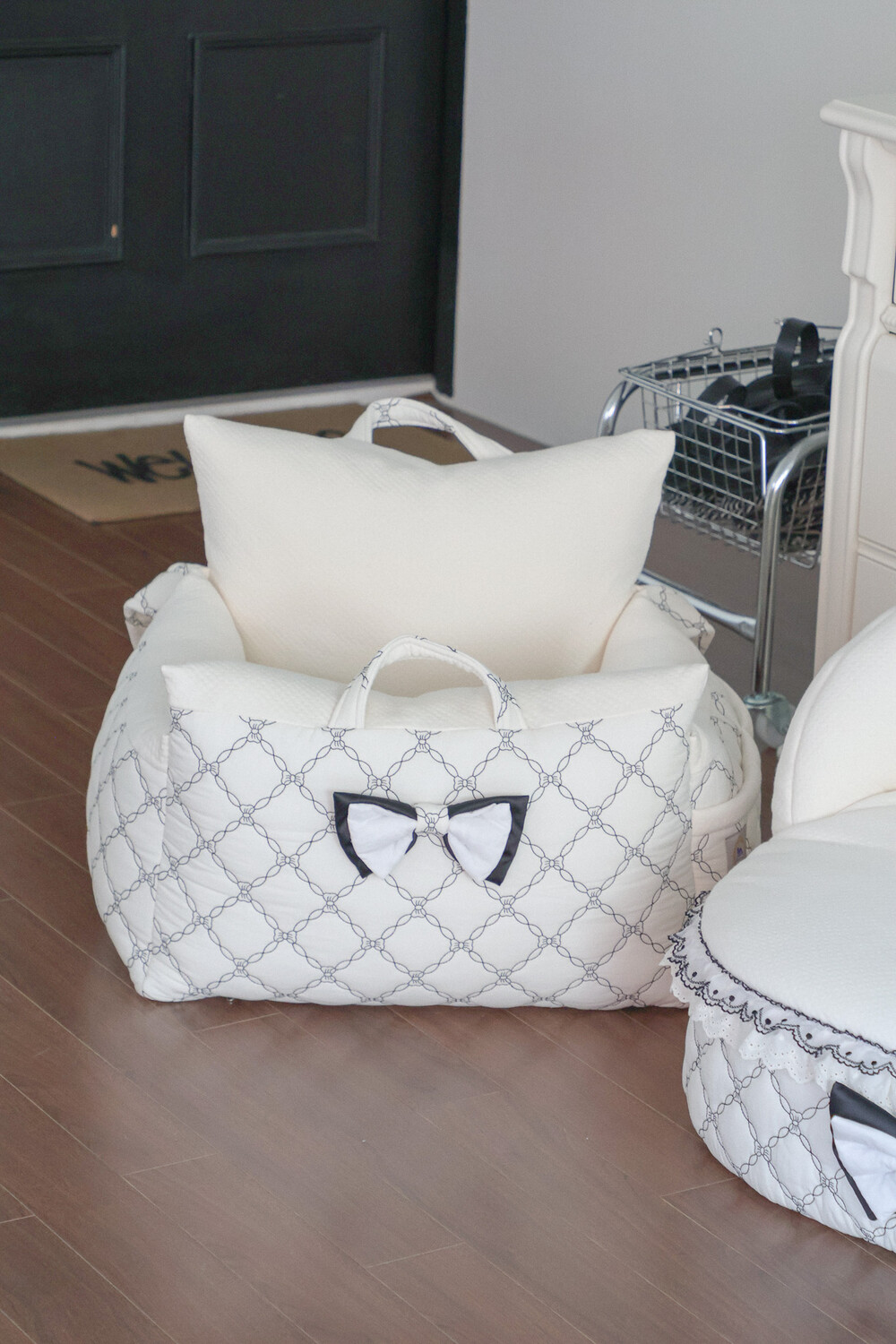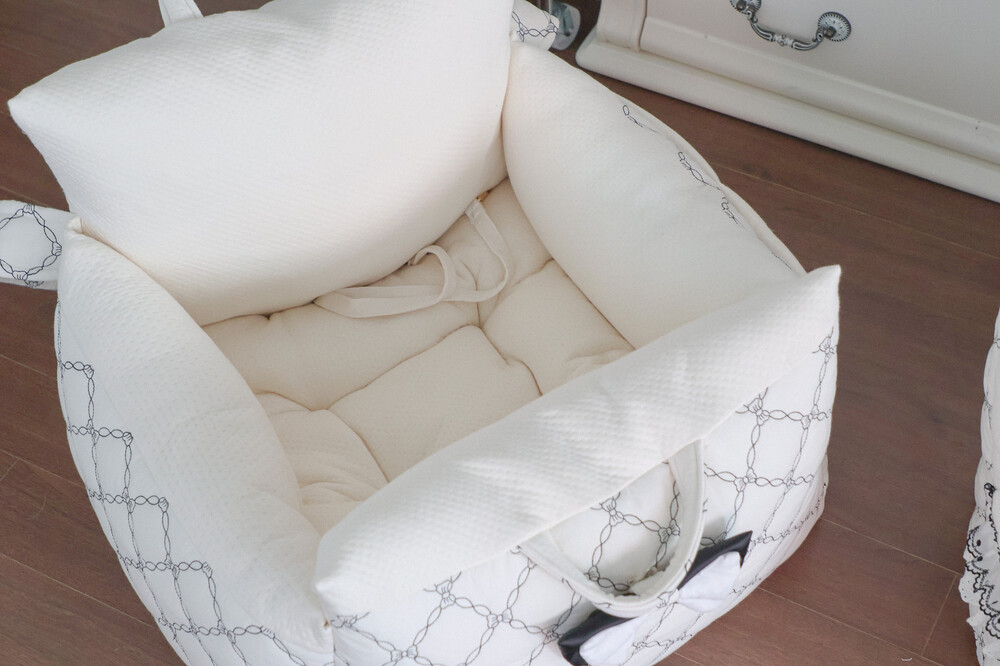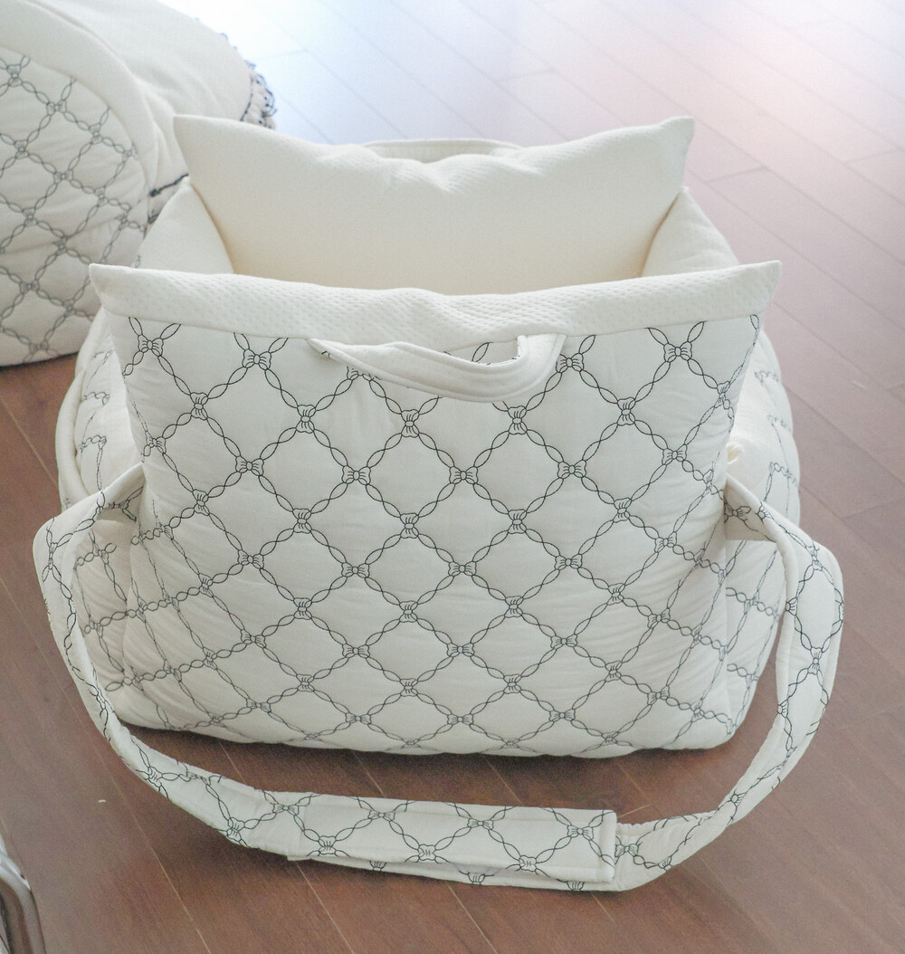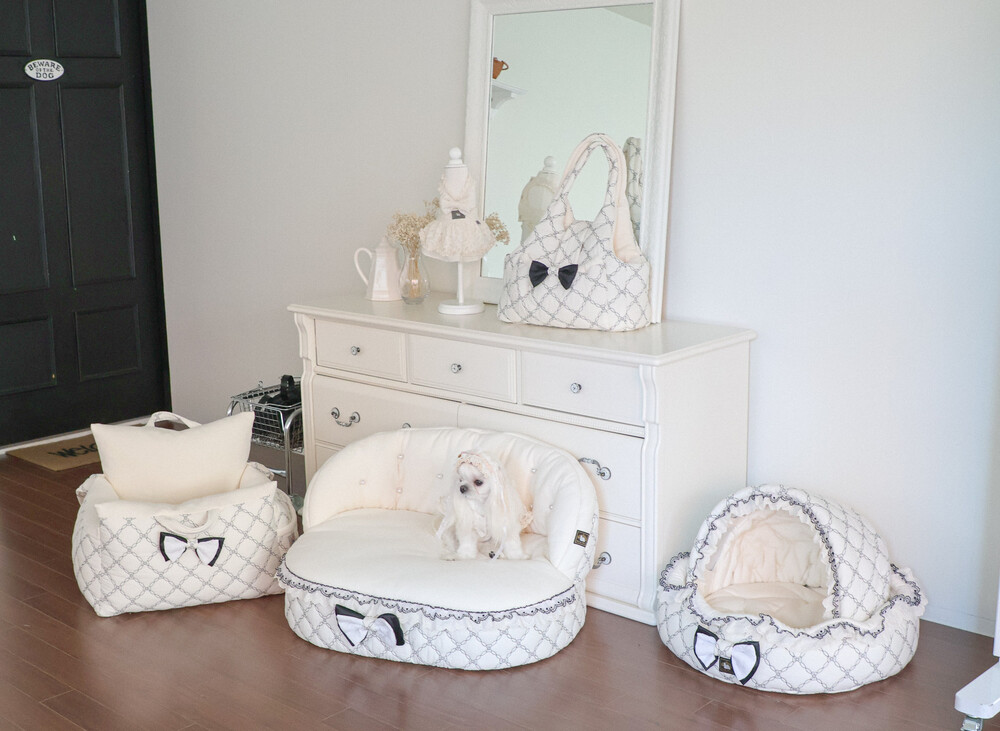 클래식한 퀼팅 자수와 블랙 리본 포인트로 완성된