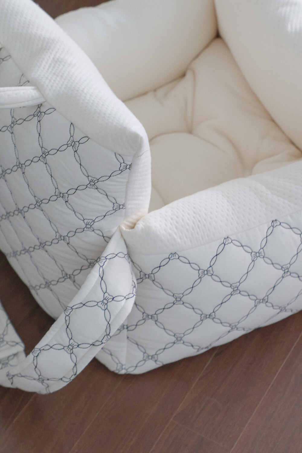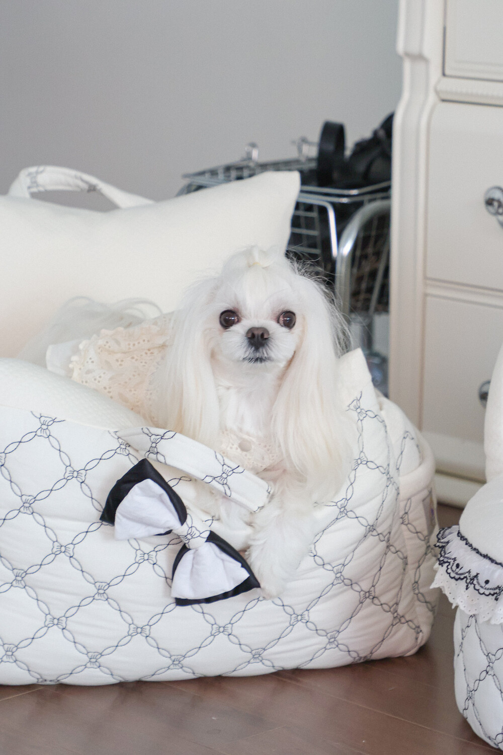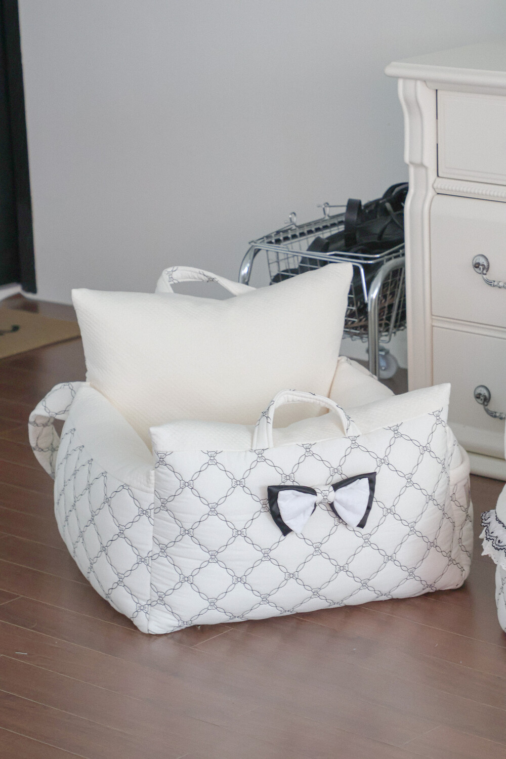 클래식한 퀼팅 자수와 블랙 리본 포인트로 완성된