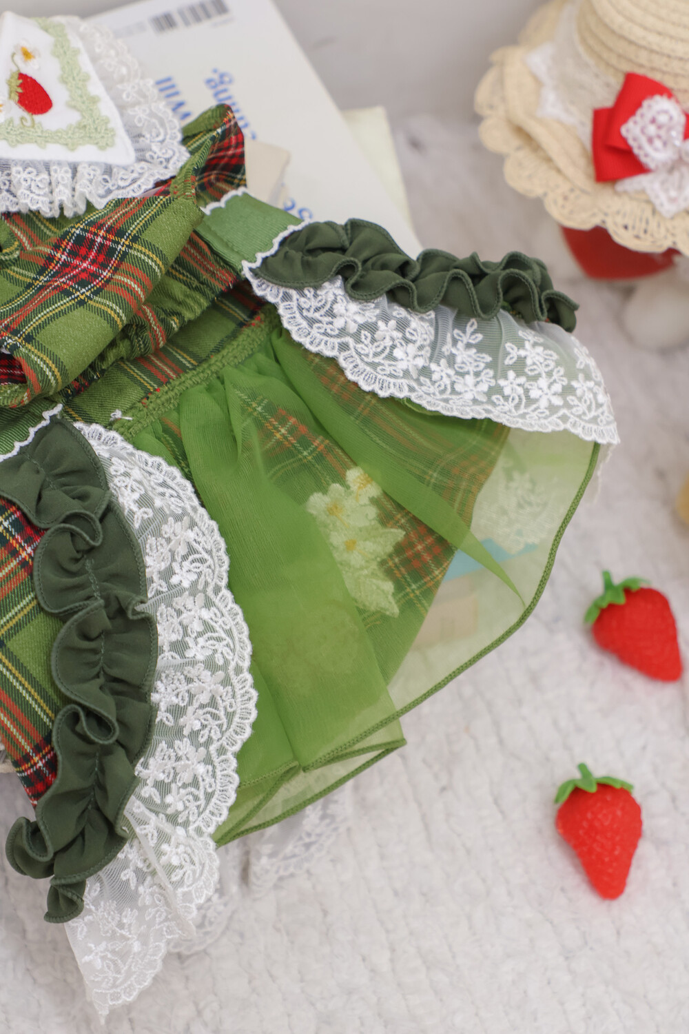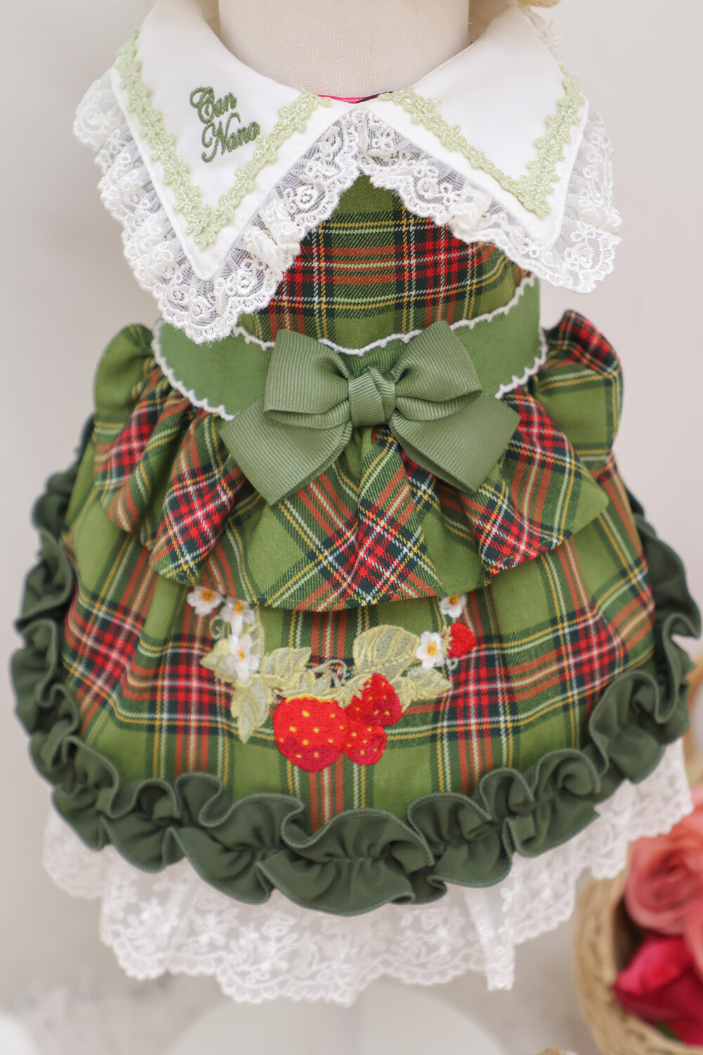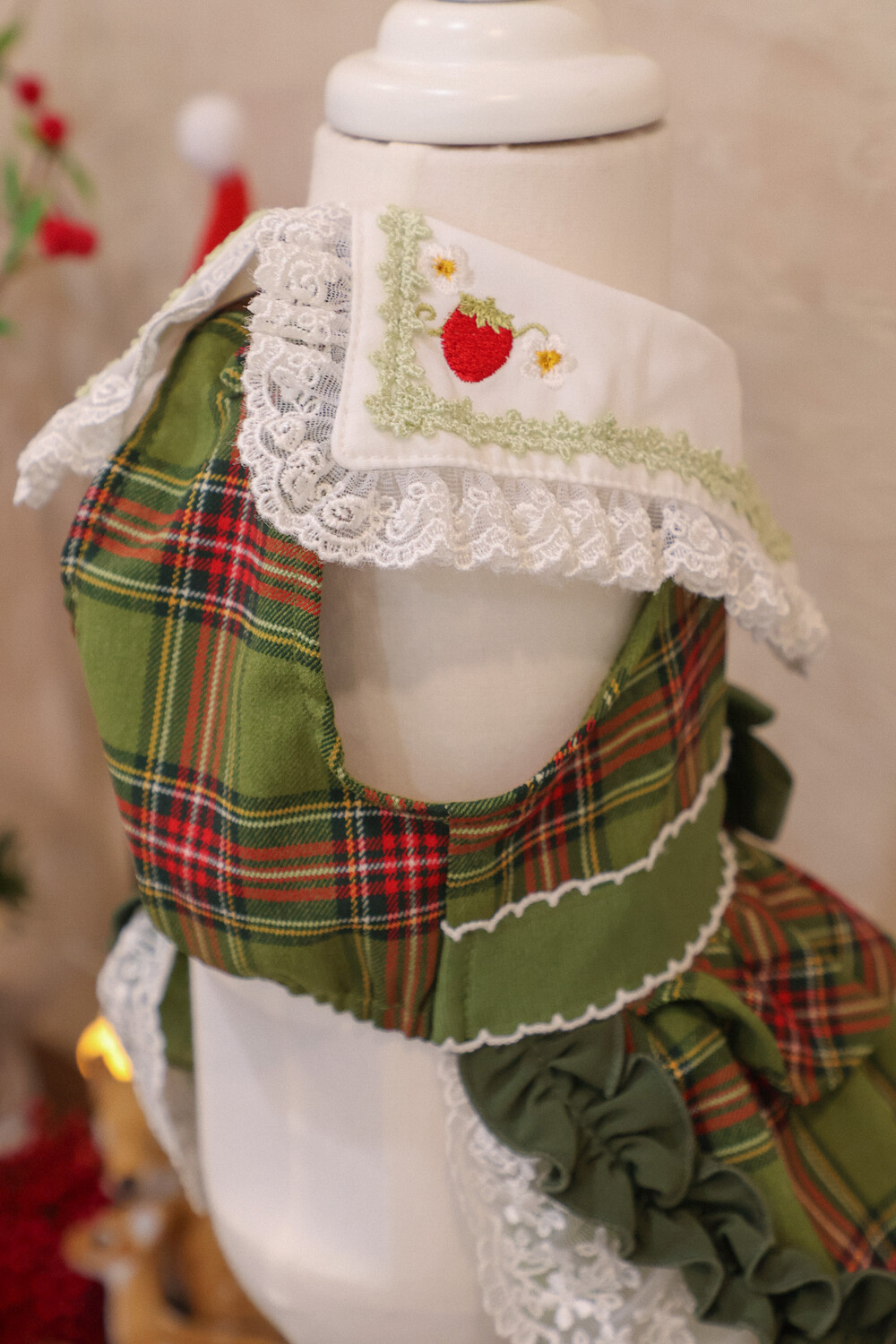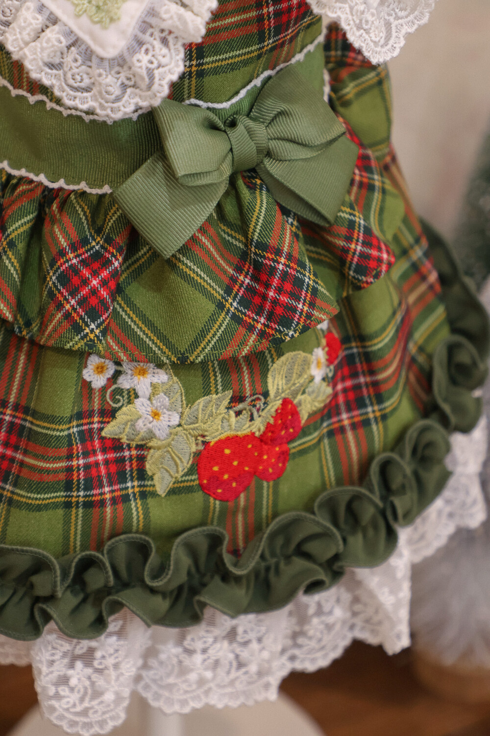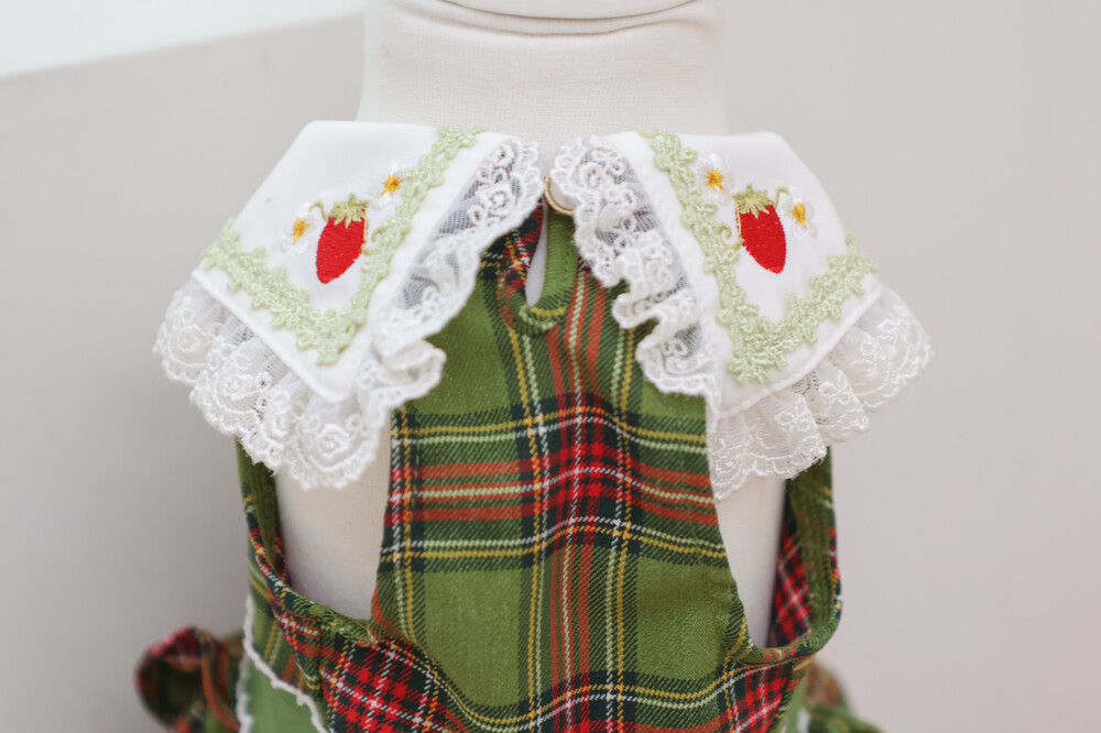 클래식한 그린 체크 패턴에 달콤한 딸기 자수가 더해진 겨울 원피스예요 ❄️✨