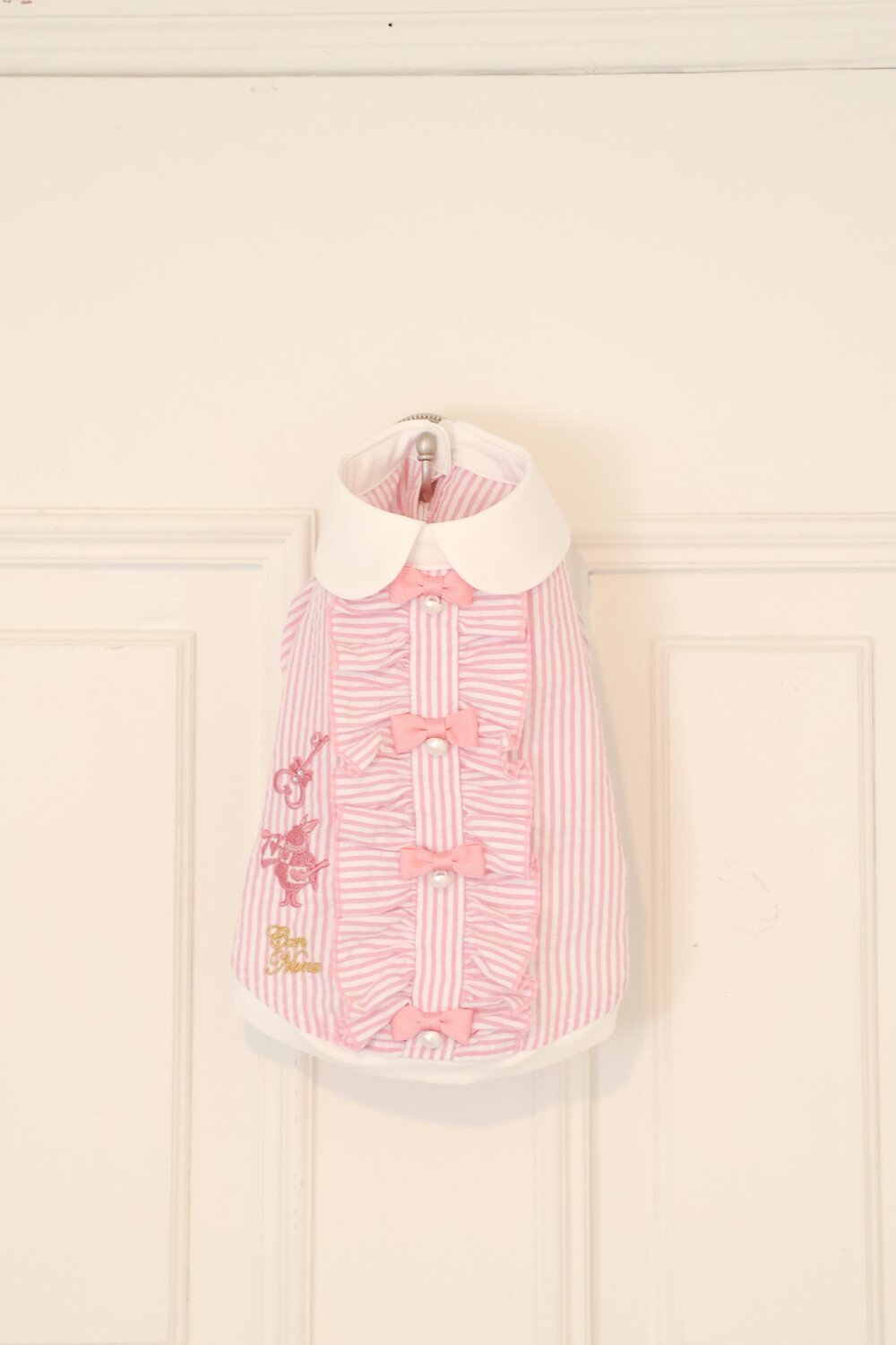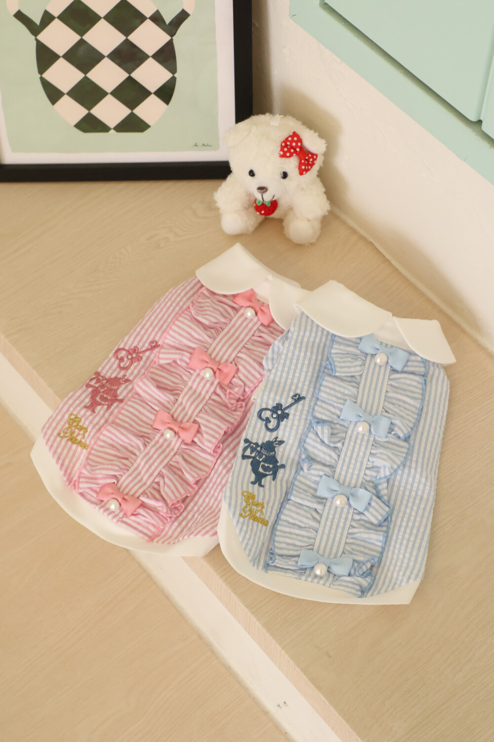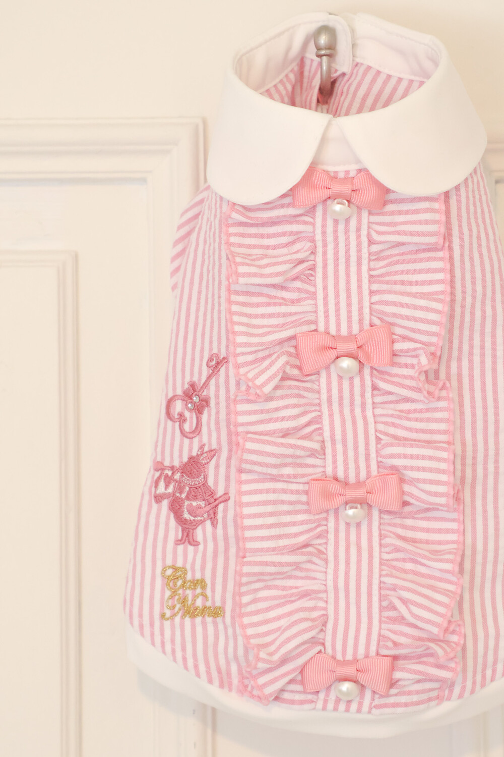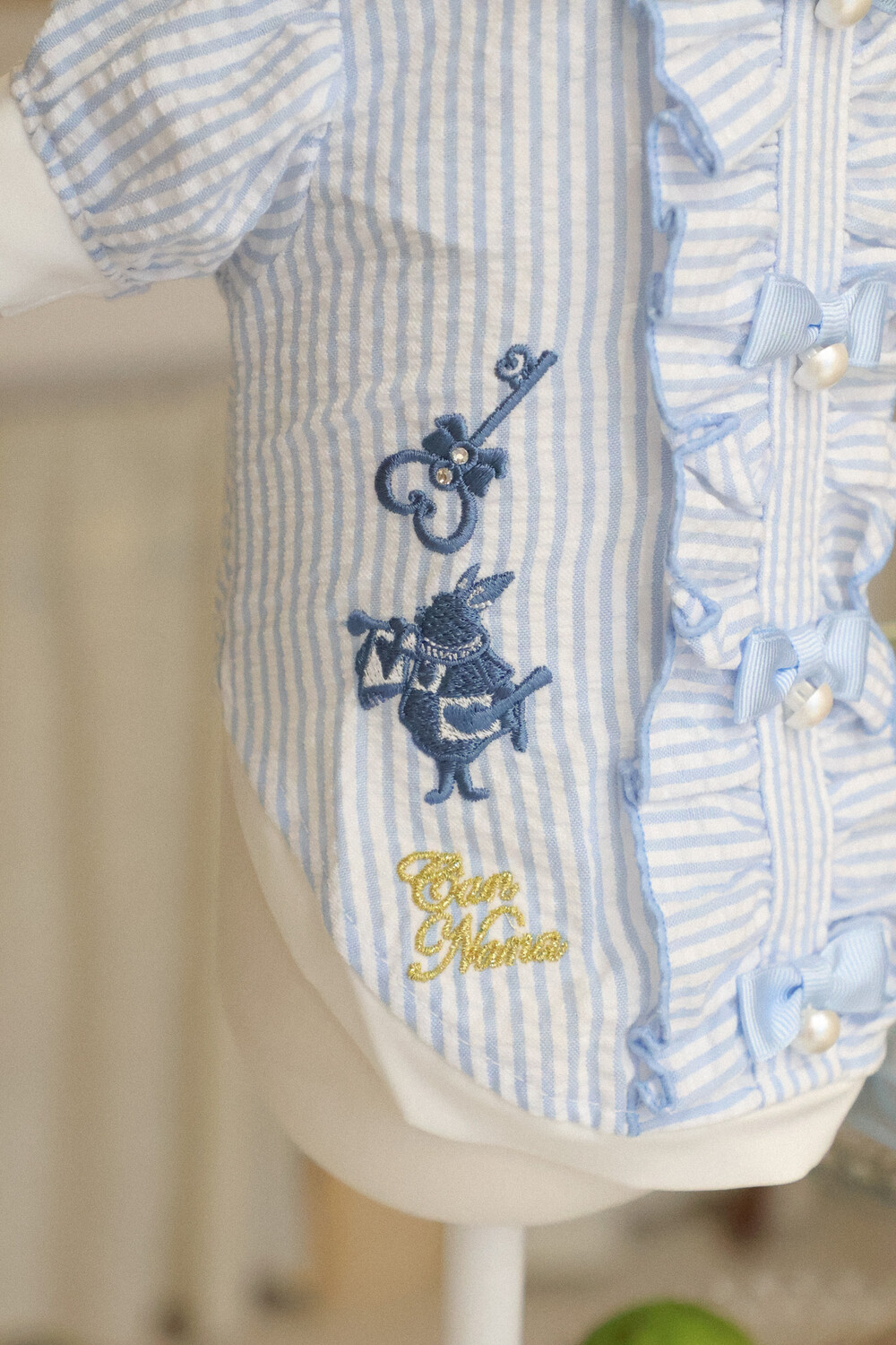 부드러운 스트라이프 원단 위에 앨리스 세계관 자수가 사랑스러운 포인트가 되어줍니다.