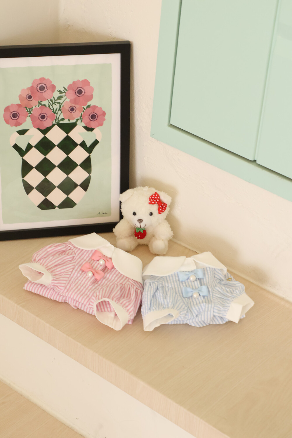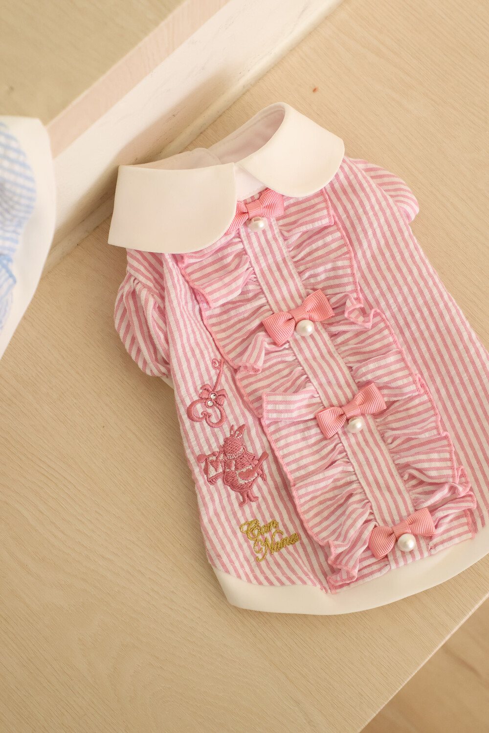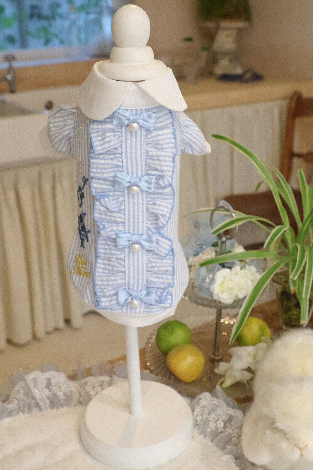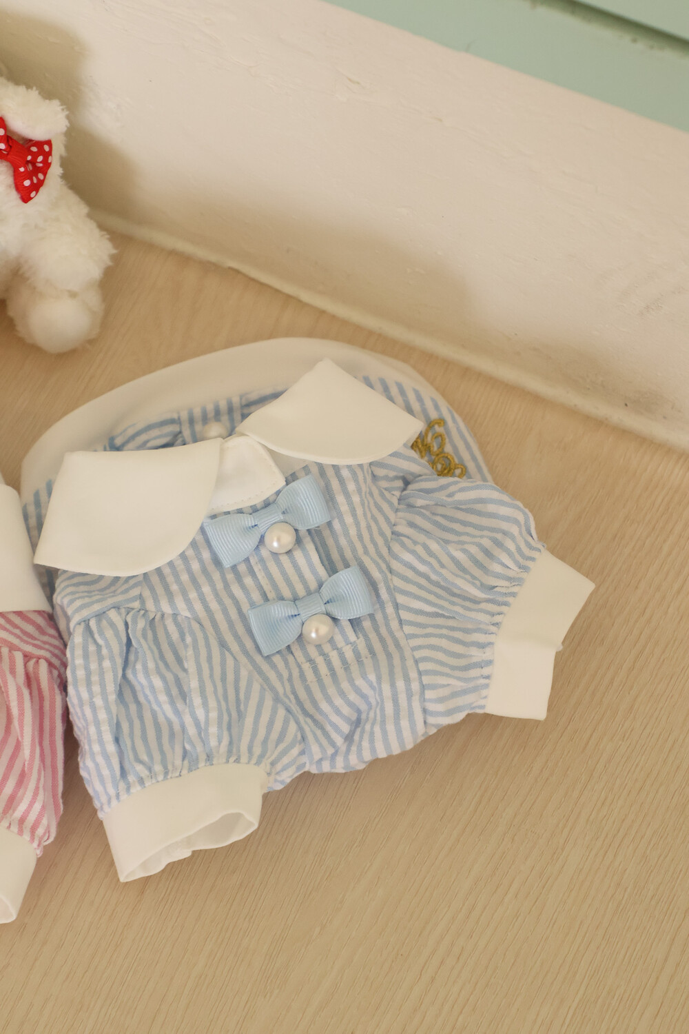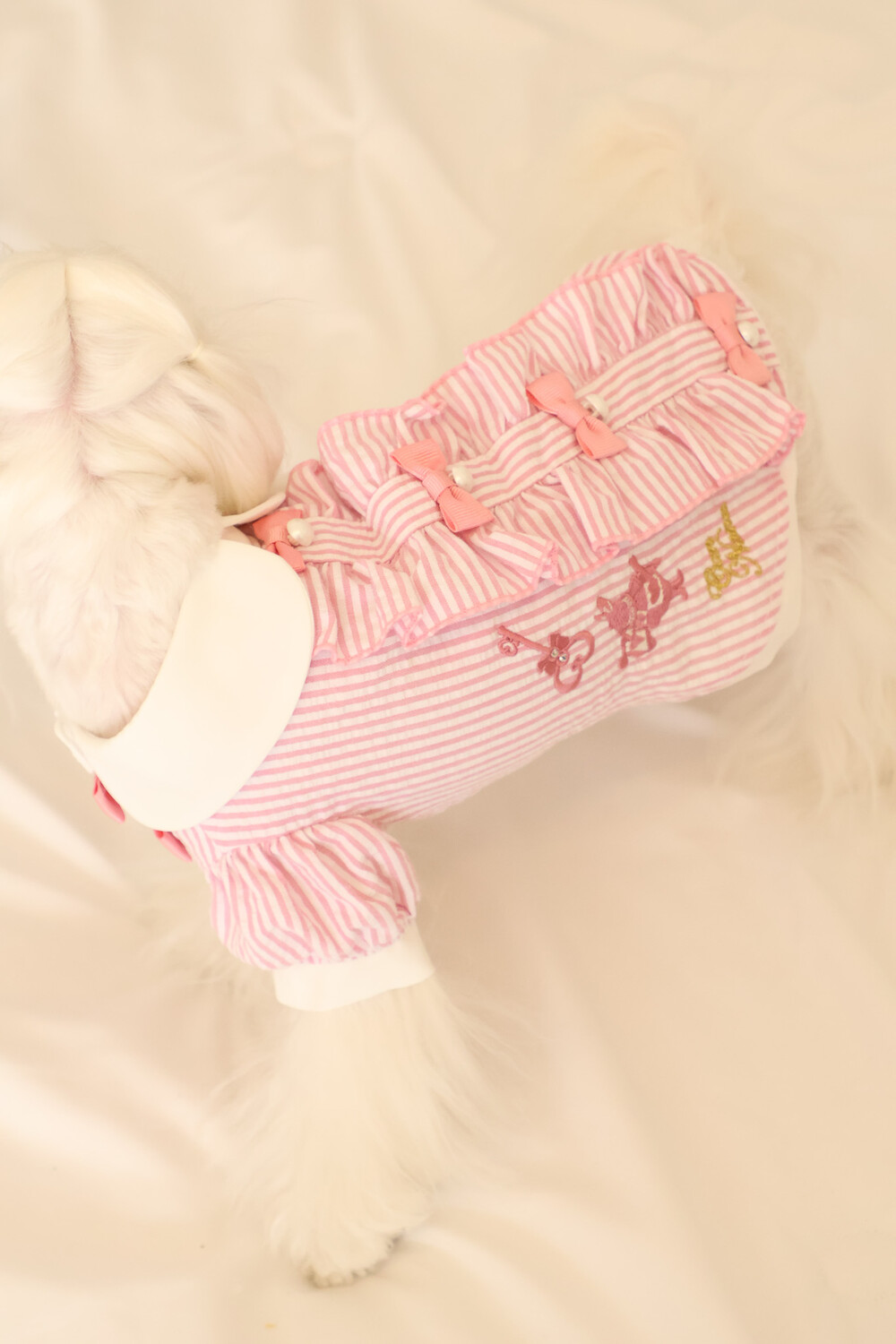 부드러운 스트라이프 원단 위에 앨리스 세계관 자수가 사랑스러운 포인트가 되어줍니다.