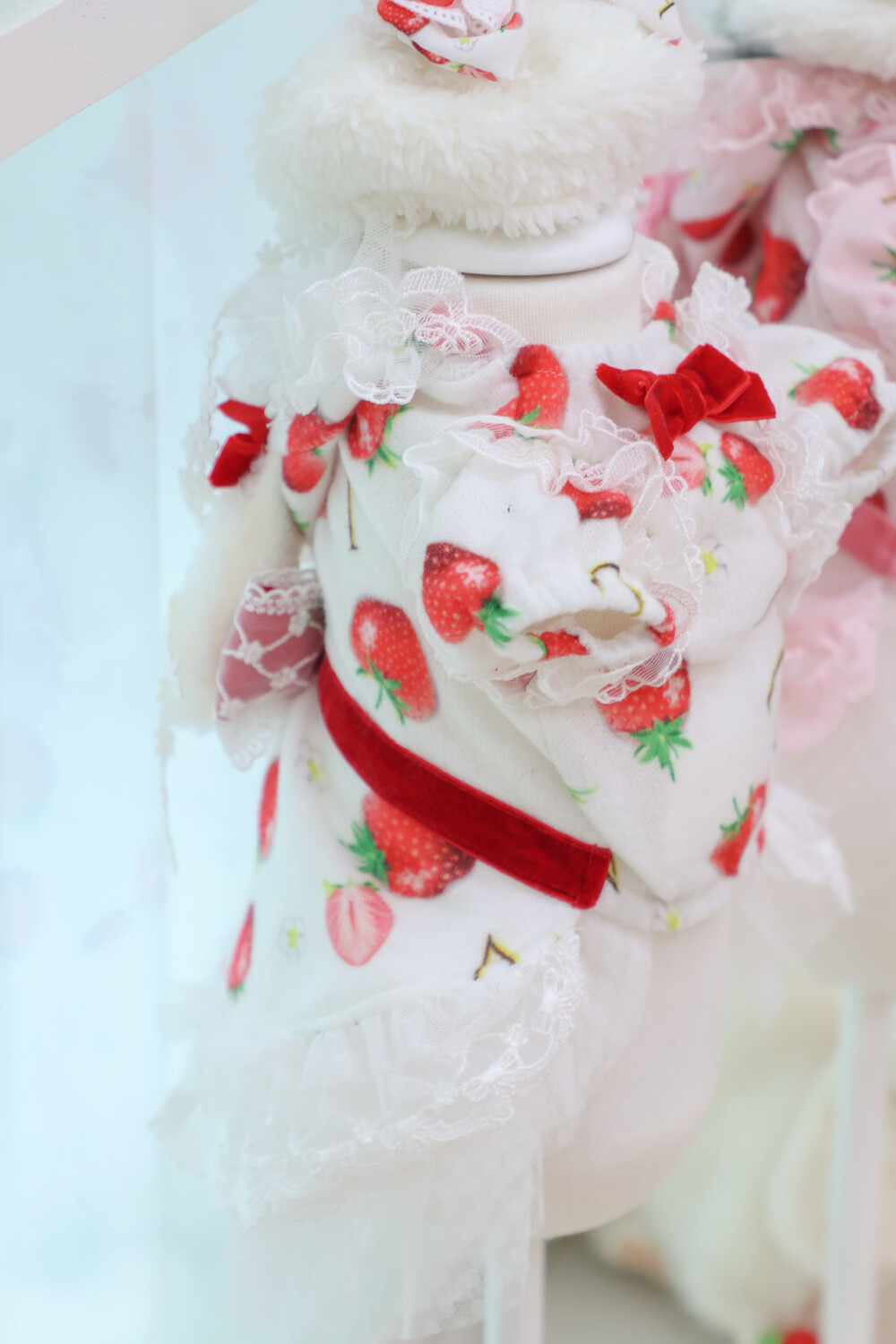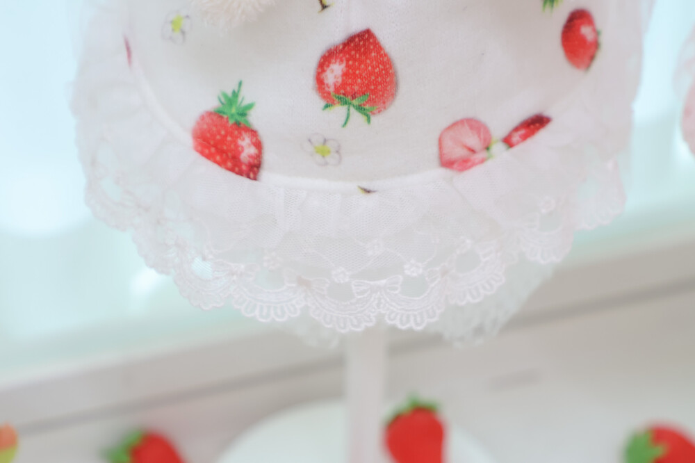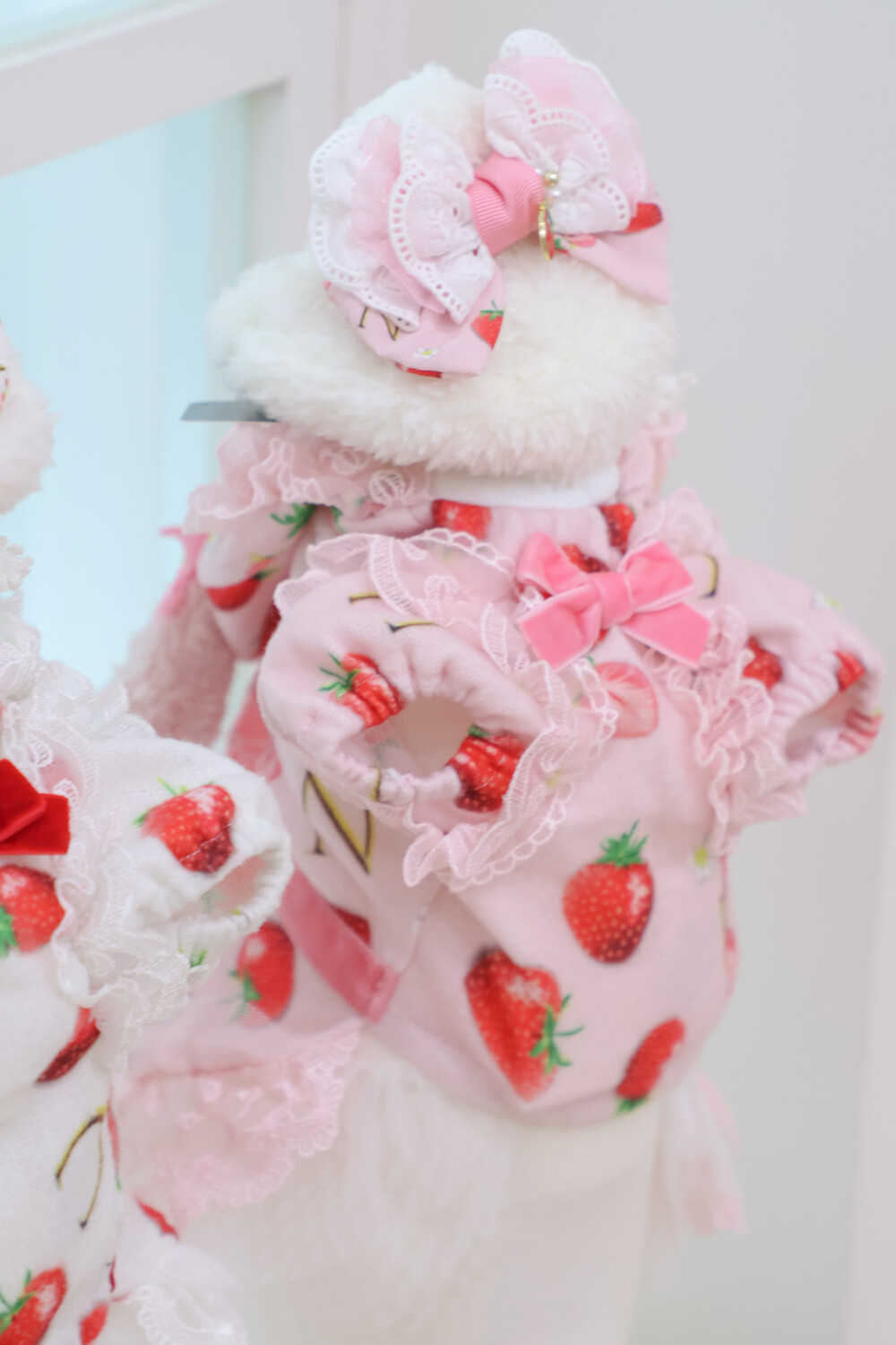 부드러운 누빔 원단 위로 퍼지는 달콤한 딸기 패턴과몽글몽글 따뜻한 무드가 어우러진 딸기토끼 드레스.